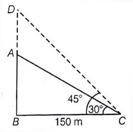 In ∠ACB=30° and ∠DCB=45° Then, AD = ? In ?ABC,tan30°=AB/BC => 13–√=AB/150 ∴ AB=86.6m In ?DBC,tan45°=DB/BC => 1=AD+AB/BC => BC = AD + 86.6 => 150 - 86.6 = AD Therefore, AD = 63.4 m