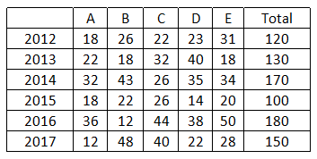 The given table shows the number (in thousands) of cars of five different models A, B, C, D and E produced during Years 2012-2017.
