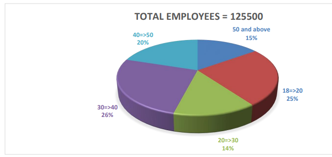 Total number of employees of age group of more than or equals to 20 year = 125500 * (14+26+20+15)% = 94125