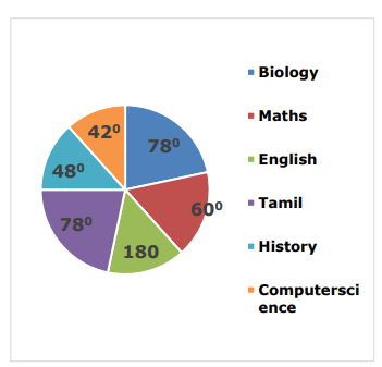 tudy the following information carefully and answer the questions given below. The given pie chart shows the degree distribution of the marks scored by Ravi in each subject. Note: The mark scored by Ravi in English is 180