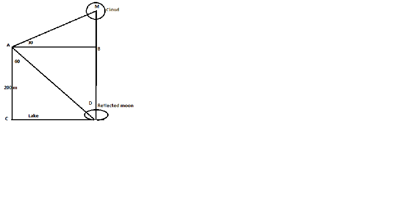 In triangle ACD, tan60=CD/AC; = > CD = 300*tan60; Since, CD=AB; Hence, tan30=MB/AB; = > MB = AB*tan30; MB=200*tan60*tan30=200m. The required height of cloud= MB+BD = 200+200=400 m