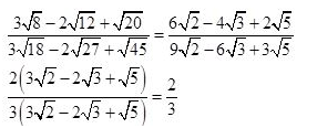 The simplest value of (3√8-2√12+√20)/(3√18-2√27+√45 is