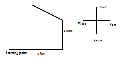 Starting from a point, a person travels 3 km towards east and turns left and travels 4 km. Then again he turns to left by 45° and moves straight. Which direction is he facing now?