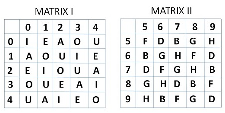 In this question, the sets of numbers given in the alternatives are represented. The columns and rows of Matrix I are numbered from 0 to 4 and that of Matrix II are numbered from 5 to 9. A letter from these matrices can be represented first by its row and next by its column, e.g., O can be represented by 03,11, etc., and 'F' can be represented by 55, 68, etc. Similarly you have to identify the set for the word 'BEAD'