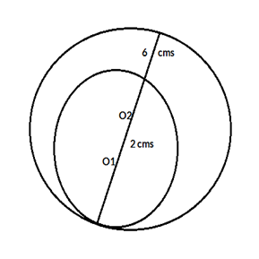 O2 is the center of the outer circle and O1 is the center of inner circle. Hence, Radius of outer circle = 6 -O1O2 = 6-2 = 4 cms.
