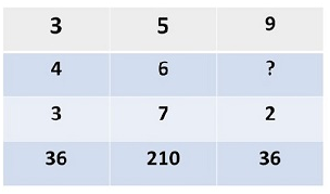in first column, 3 * 4 * 3 == 36; In second column, 5 * 6 * 7 == 210; In third column, 9 * x * 2 = 36; => x = 2