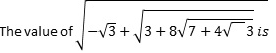 Put √3 = 1.732 in the given expression- 7 + 4√3 = 13.928; => √(7 + 4√3) = 3.73; √(3 + 8√ (7 + 4√3) = 5.73; √(-√3+(√(3 + 8√ (7 + 4√3) = 1.999 ~ 2