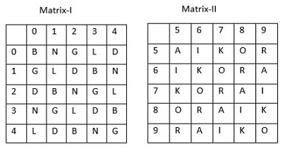 In the question, a word is represented by only one set of numbers as given in any one of the alternatives. The sets of numbers given in the alternatives are represented by two classes of alphabets as in two matrices given below. The columns and rows of Matrix I are numbered from 0 to 4 and that of Matrix II are numbered from 5 to 9. A letter from these matrices can be represented first by its row and next by its coloumn,e.g., B can be represented by 00,13, etc, and A can be represented by 55,69, etc. You have to identify the set for the word 'LION'.