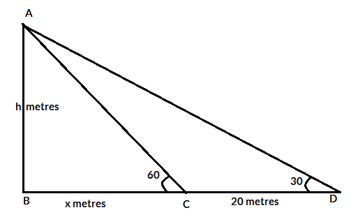 In Triangle ABC, tan60= h/x; => h = √3 x; In Triangle ABD, tan30= h/(x+20); => √3h= x + 20; Put the value of h in the above equation- 3x = x + 20; => x =10 metres; Hence, the height of tower = 10√3 metres;