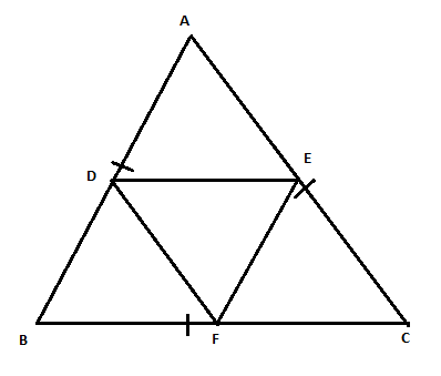 By the mid-point theorem- Area(ADF) = Are(BDF)=Area(DEF)=Area(CEF)= ¼*Area(ABC); Hence, the required ratio = Area(ABC): ¾ * Area(ABC) = 4: 3