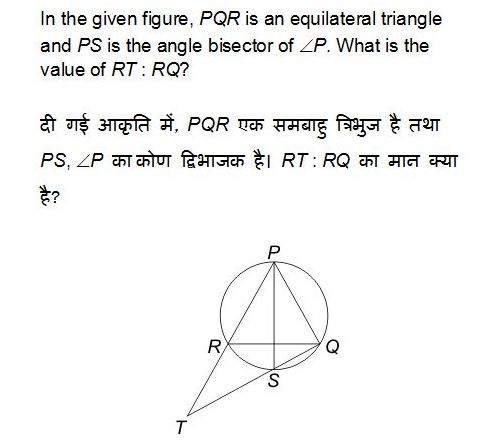Triangle PQR is an equilateral triangle and PS is abisector of angle RPQ therefore, angle PRQ=angle RPQ=60 and angleRPS=angleQPS=30 Again as angle RPS and angle RQS are lie in the same segmant of the same circle therefore angle RPS=angle RQS =30 angleTRQ=180-angle PRQ=180-60=120 in triangle RTQ, we have angle RTQ +angle TQR + angle TRQ=180 angle RTQ + 120+ 30=180 therefore, angle RTQ=180-150=30 therefore , we can say triangle RTQ is an isoceles triangle whose RQ=RT therefore, RT:RQ=1:1