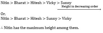 Hitesh, Sunny, Vicky, Nitin and Bharat are arranged in ascending order of the height from the top. Hitesh is at third place. Bharat is between Nitin and Hitesh while Nitin is not at the bottom. Who has the maximum height among them?