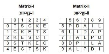 A word is represented by only one set of numbers as given in any one of the alternatives. The sets of numbers given in the alternatives are represented by two classes of alphabets as in two matrices given below. The columns and rows of Matrix I are numbered from 0 to 4 and that of Matrix II are numbered from 5 to 9. A letter from these matrices can be represented first by its row and next by its coloumn,e.g., C can be represented by 85,98 etc. similarly you have to identify the set for the word STEAL