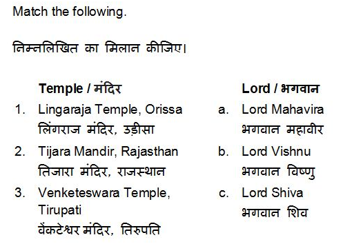 Lingaraja Temple, Orissa-->Lord Shiva Tijara Mandir, Rajasthan--->Lord Mahavira Venketeswara Temple, Tirupati--->Lord Vishnu