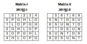 In the question, a word is represented by only one set of numbers as given in any one of the alternatives. The sets of numbers given in the alternatives are represented by two classes of alphabets as in two matrices given below. The columns and rows of Matrix I are numbered from 0 to 4 and that of Matrix II are numbered from 5 to 9. A letter from these matrices can be represented first by its row and next by its column, e.g., 'O' can be represented by 30,23 etc and 'D' can be represented by 76,88, etc. similarly you have to identify the set for the word 'POND'