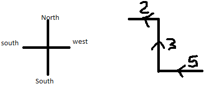 ‘X’ started walking towards the west, after travelling 5 kilometres turned exactly to his right and walked 3 kms. Then he decided to walk exactly to his left. On reaching 2 kilometres, he heard a voice and walked back. Then he noticed that, his friend ‘Y’ was walking towards him from his right side. In which direction is ‘Y’ walking?