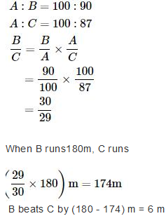 In a 100 m race A beats B by 10 m and C by 13 m In a race of 180 m B will beat C by ........