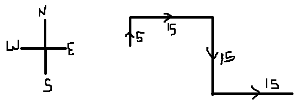 Manoj walks a distance of 5 meters towards North, then he turns to east and walks a distance of 10 meters. Then he turns to his right and covers a distance of 15 meters. He then turns to his left and covers a distance of 15 meters. Which direction is he facing now?