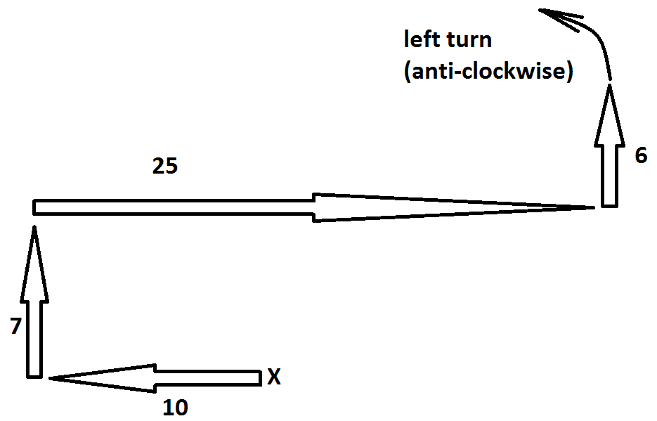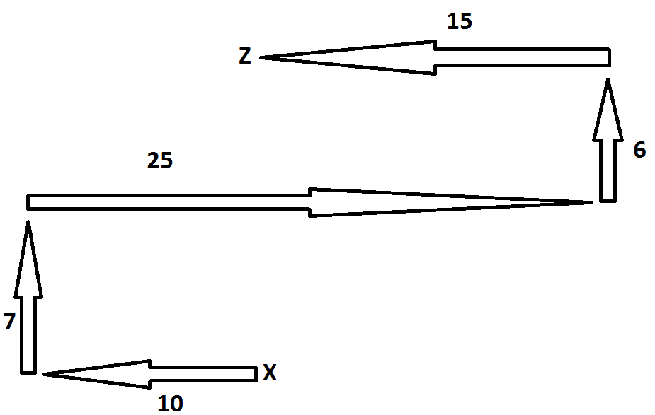 Directions: Jay starts his van from point X and covers a distance of 10 km towards west, then he turns north and covers a distance of 7 km. Again, he takes a right turn and covers 25 km. Now he covers 6 km, after taking a left turn. At last he takes a left turn and covers 15 km and stops at point Z.