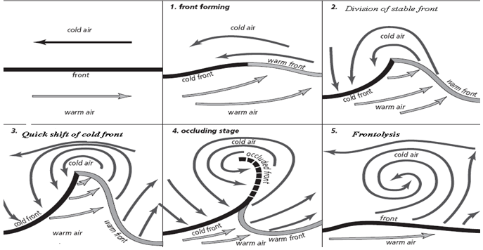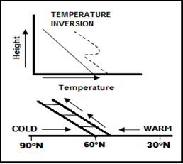 1) Frontal situation of middle latitudes represents case of temperature inversion as in a front, warm air rises over cold air.