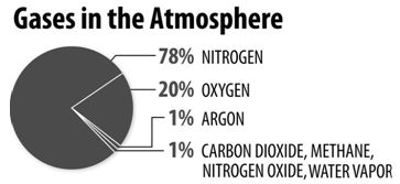 The Earth is surrounded by a relatively thin atmosphere consisting of a mixture of gases, primarily molecular nitrogen (77 percent) and molecular oxygen (21 percent). This gaseous envelope, commonly called the air, also contains much smaller amounts of gases such as argon, carbon dioxide, methane, and water vapour, along with minute solid and liquid particles in suspension.