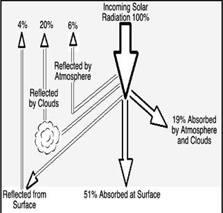 The solar energy travels towards the Earth at light speed, in the form of ultraviolet radiation, visible light, and infrared radiation. When this energy reaches the Earth, immediately 30% of it bounces off, being reflected back into space. The ability to reflect the light and radiation of the Sun is known as an object’s albedo[2]. Because the Earth reflects 30% of the light that hits it, it is said that the Earth has an albedo of 30. In contrast, our moon has an albedo of [3] to 11. Because 30% of the electromagnetic energy from the Sun has been reflected away, only 70% remains to interact with the Earth, and warm it up. 20% of the energy from the Sun is absorbed by the atmosphere as a whole heating it up. 2% is reflected by the snow. This leaves around 50% of the Sun’s energy to heat both the surface of the Earth, as well as the oceans, lakes and streams. This heat is absorbed by the earth and later released as long wavelength radiations.