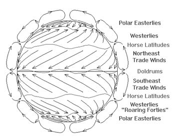 [5] The name horse latitudes probably originated during a period when horses were being shipped from New England to the West Indies. The term was applied to a part of the North Atlantic Ocean where sailing ships were becalmed for long periods of time. Frequently, the horses died of heat and thirst and were thrown overboard.