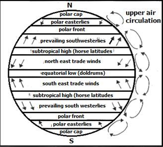 The general permanent circulation of surface winds throughout the world is denoted by the term planetary winds. The wind belts are basically controlled by the latitudinal pressure belts and by the forces produced by rotation of the earth.