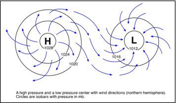 The net effect of these forces is that near surface winds spiral outward away from high pressure centers and inward toward low pressure centers.