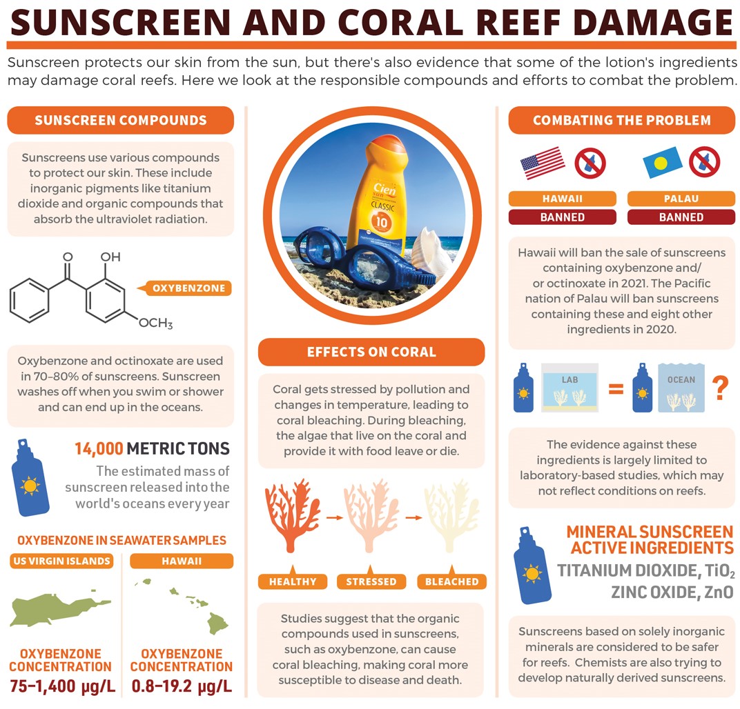 Context: Recently, the United States Virgin Islands (USVI) banned sunscreen products with chemicals include those containing 3 Os: oxybenzone, octocrylene and octinoxate known to be harmful to coral reefs and marine life. Key Findings