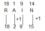 In a certain code language, 'RAIN' is written as '182915' and 'SUN' is written as '192214'. How will 'MOON' be written in that language?