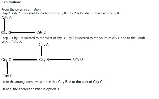 City A is located to the North of city B. City D is located to the East of city B. City C is located to the West of city D. City E is