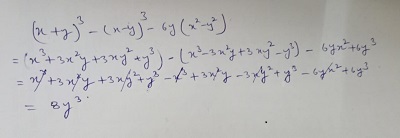Simplify: $$\left(x + y\right)^{3}− \left(x − y\right)^{3} − 6y\left(x^{2} − y^{2}\right)$$