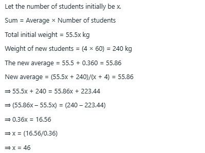 The average weight of a certain number of students in a class is 55.5 kg. If 4 students with average weight 60 kg join the class, then the average weight of all students in the class increases by 360 g. The number of students in the class, initially, is: