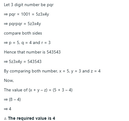 Given: The six digit number = 5z3x4y Concept used: Divisibility rule of 7 - The difference between twice the unit digit of the given number and the remaining part of the given number should be a multiple of 7 or it should be equal to 0. Divisibility rule of 11 - If the difference between the sum of the digits at the odd and even places equals 0 or divisible by 11, then the number is divisible by 11. Divisibility rule of 13 - A number is divisible by 13 when the ones place digit of a number is multiplied by 4 and the product is added to the rest of the number either gives 0 or a multiple of 13. 7 x 11 x 13 = 1001, when any three digit number multiplied by 1001 then it repeats itself and always completely divisible by 7, 11 and 13.