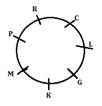 Seven persons - G, M, R, K, L, P and C - are sitting around a circular table facing the centre. The following information is known about them. G is to the immediate right of K, who is third to the left of C. R is adjacent to both C and P. M is not adjacent to G.