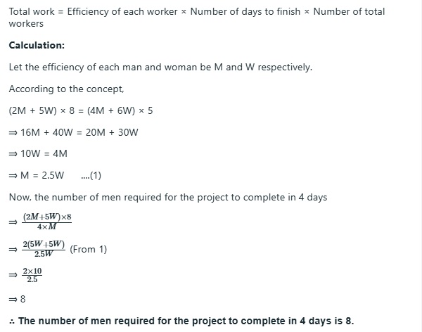 A project can be completed by 2 men and 5 women in 8 days while 4 men and 6 women can complete the same project in 5 days. How many men will be required to complete this project in 4 days?