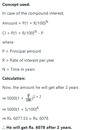 Mohan invested Rs5,000 in a bank which offered interest at the rate of 10% per year compounded semi-annually. How much amount will he get after 2 years? [Give your answer correct to the nearest integer value.]