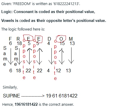 In a certain code language, 'FREEDOM' is written as '618222241213'. How will 'SUPINE' be written in that language?