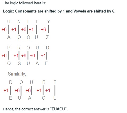 In a certain code language, 'UNITY' is written as 'AOOUZ' and 'PROUD' is written as 'QSUAE'. How will 'DOUBT' be written in that language?