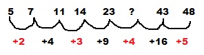 Which number will replace the question mark in the following series 5 7 11 14 23 43 48 ........