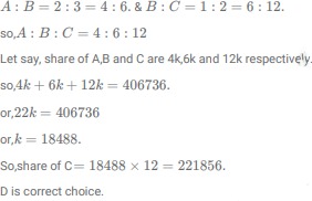 Rs 4,06,736 is divided among A, B and C such that the ratio between A and B is 2 : 3 and B and C is 1 : 2. The share of C is: