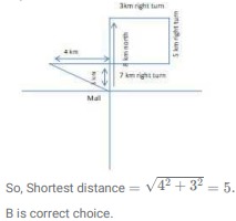turned right and walked 5 km. Again. he turned right and walked 7 km. What is the shortest distance from the mall to Kartik’s final