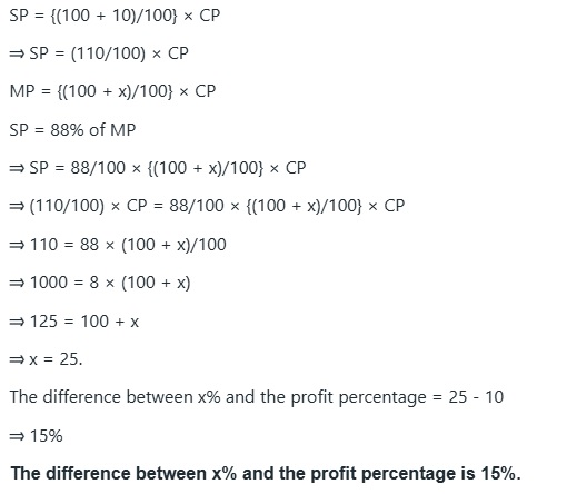 A person marks his goods x% above the cost price and allows a discount of 12% on the marked price. If his profit is 10% then the difference between x% and the profit percentage is :