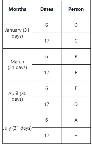 Eight friends A, B, C, D, E, F, G and H have to deliver lectures on either the 6 or 17 of four different months among January, March, April and July but not necessarily in the same order. Not more than 2 persons will give a lecture in a month. Only one person will deliver a lecture each day. A delivers his lecture on the 6 of a month which has only 31 days but not in the month of March. E delivers the lecture immediately after B. Only three lectures were delivered between A and B. Only two persons give lectures between F and C and C is not the last one. The number of persons who give the lecture after E is the same as the number of persons who give the lecture before F. G and C give their lectures in the same month. D gives the lecture before H.