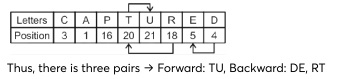 How many pairs of letters are there in the word “CAPTURED” that have the same number of letters between them in the word (in both forward and backward directions), as they have in the English alphabetical series?