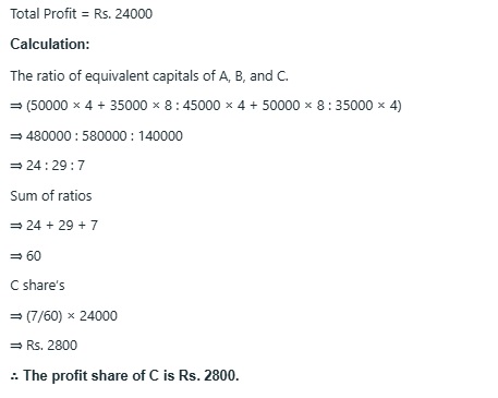 A and B start a business with Rs. 50000 and Rs. 45000. After 4 months A withdrawn Rs. 15000 and B invest Rs. 5000 more and C joined the business with Rs. 35000 only for the next 4 months. If the total annual profit is Rs. 24000. What will be the profit share of C?
