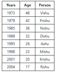 There are eight people: Ashu, Dishu, Krishu, Mishu, Nishu, Rishu, Prishu, and Vishu. They all were born in different years viz. 1973, 2001, 1985, 1979, 2004, 1989, 1995, and 1998 but not necessarily in the same order. But the date and month of birth of all these persons are the same. The calculation is done with respect to the present year 2021 and assuming months and date to the same.