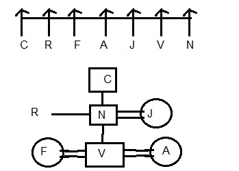7 people A, C, F, J, N, R and V, all are related to V in some way, and are facing north. J sits third from the extreme end. V’s father sits second to the right of J. Only 3 people are sitting between V’s father and V’s sister. As many people sit to the left of V’s sister as to the right of V’s mother. Only one person sits between N and V’s mother. N is the son of C. A sits third to the right of C. C is the father of R. F sits to the immediate right of R. V’s wife sits second to the left of V.