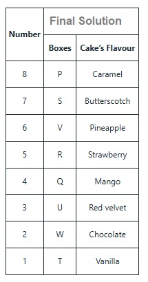 Box W is placed just above the Vanilla flavour box. There are more than three boxes between Pineapple and Vanilla flavour box. There are two boxes between box S and Q and box S does not have Vanilla flavour cake. There is only one box between box Q and W. There are three boxes between box V and W which is having Chocolate flavour cake. There are two boxes between V and U which is having Red velvet flavour cake. The butterscotch flavour cake box is placed just above V. There are more than three boxes between Caramel and Vanilla flavour box. Pineapple flavour box is not on the Top. There is the same number of boxes between box S and U and between box R and T. Strawberry flavour box is placed above the Mango flavour box. Box T is neither Strawberry nor Butterscotch flavour. Box V is placed above W but W is not placed at the bottom.